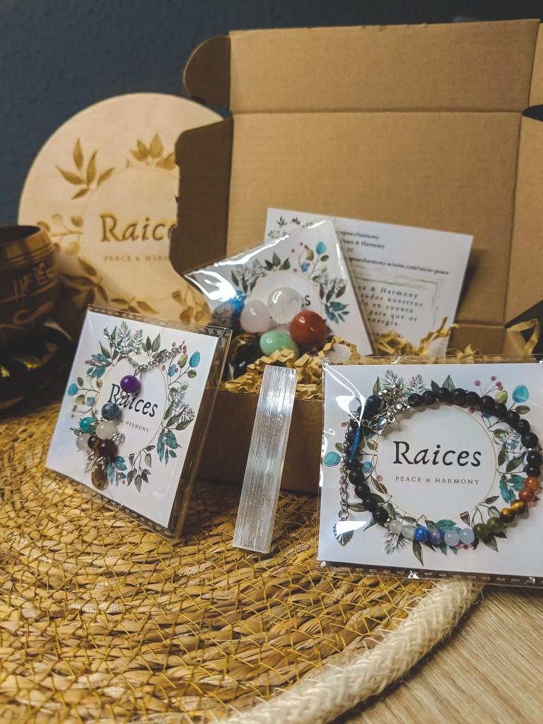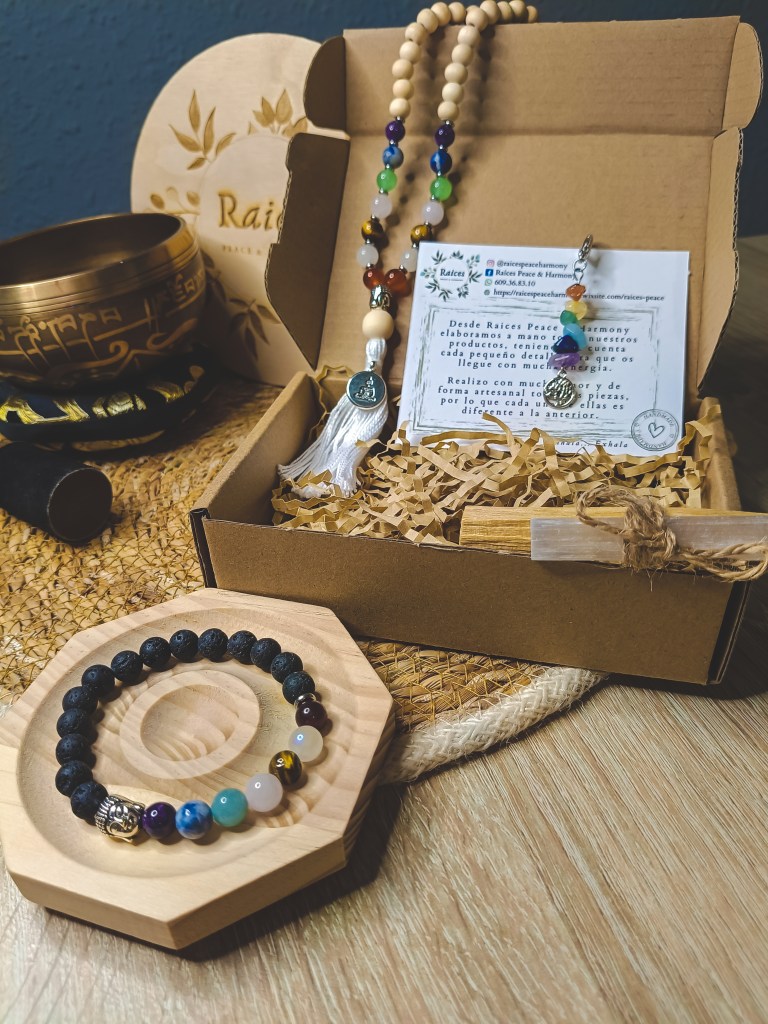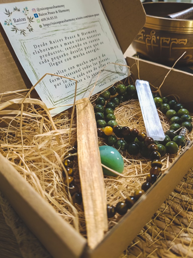 Cada kit está pensado como un detalle lleno de intención. En ellos se reúnen distintas creaciones, pulseras, collares, amuletos o minerales, seleccionadas según la energía que quieras atraer o regalar.